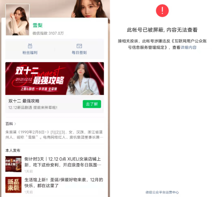 嚯,昨天还在发布双十二活动预告的雪梨官方公众号,现在因账号被屏蔽,内容无法查看了。