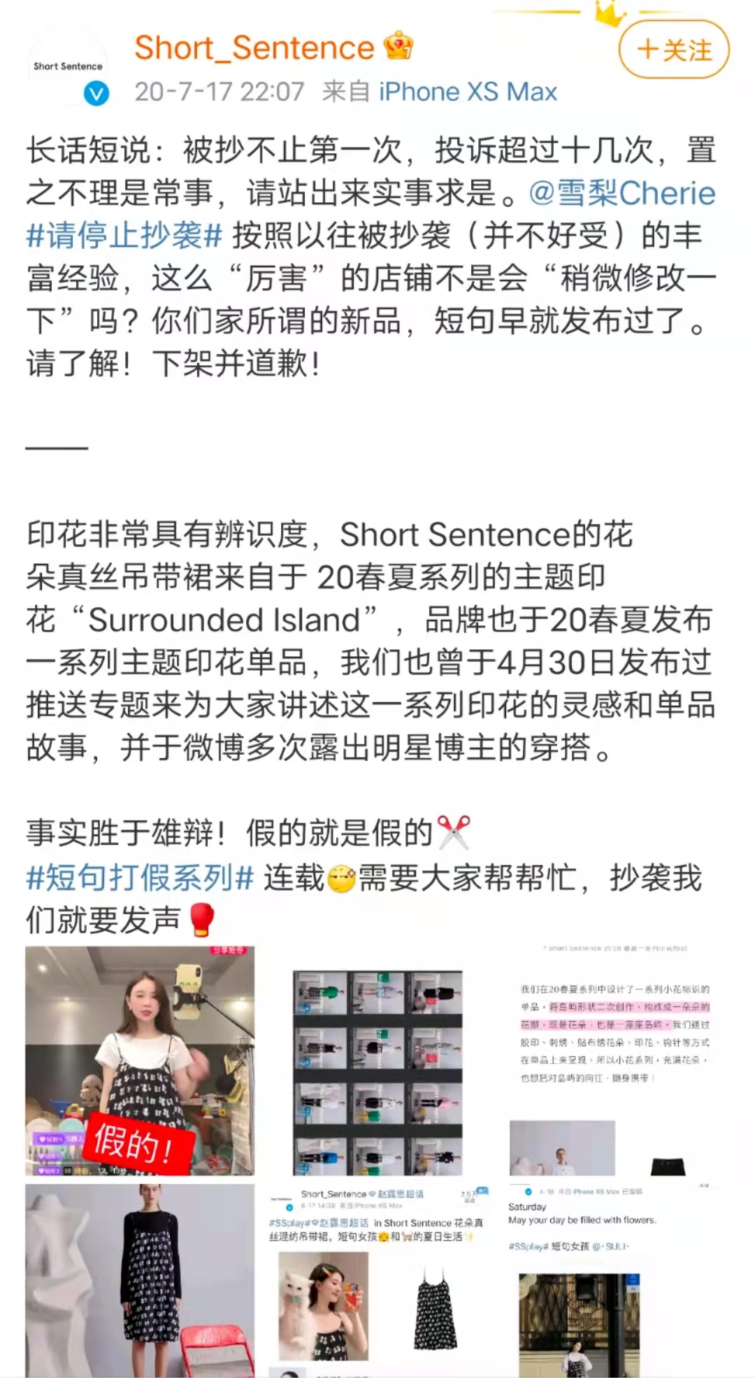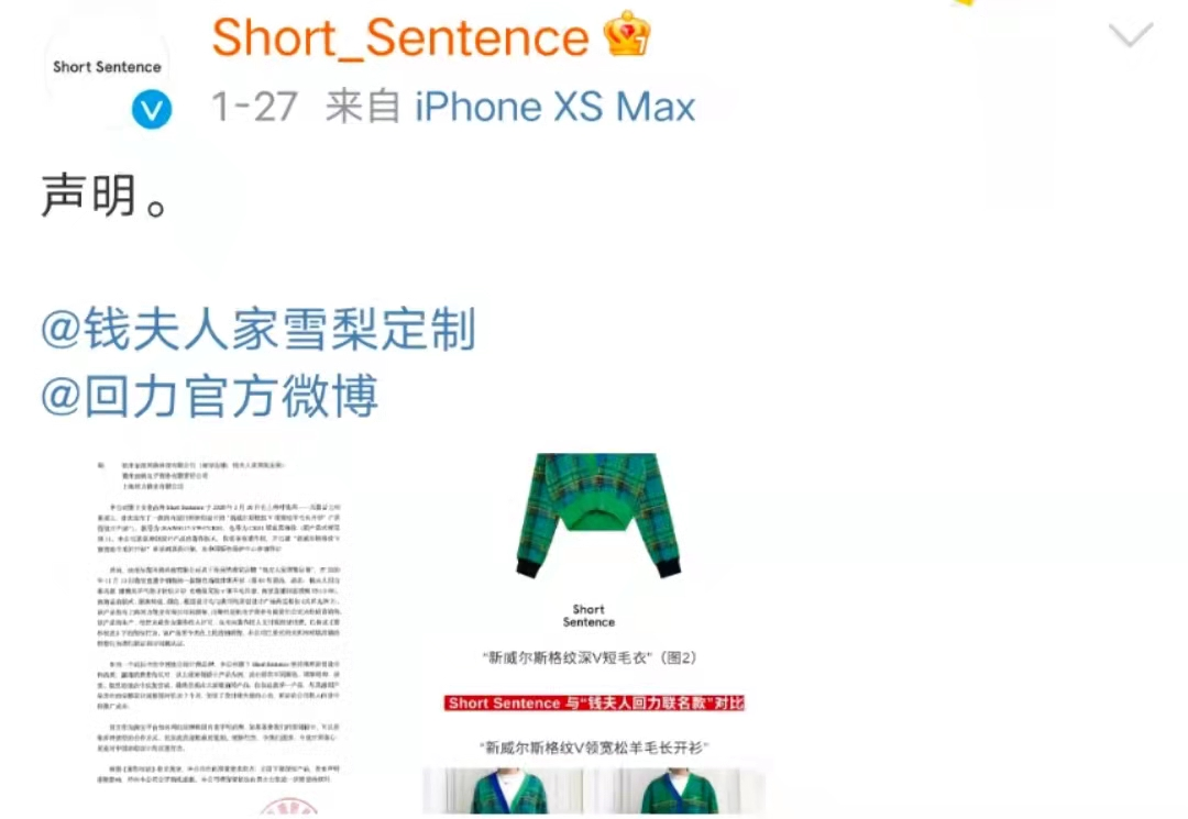 屡次中枪的Short Sentence品牌也在微博直接开挂雪梨淘宝店的某件外套,表示其又又一次抄袭了自家设计。