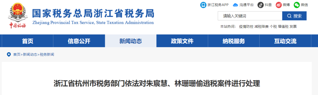 11月22日,国家税务总局浙江省税务局发布公告:朱宸慧和林珊珊两人涉嫌偷逃税款被罚。