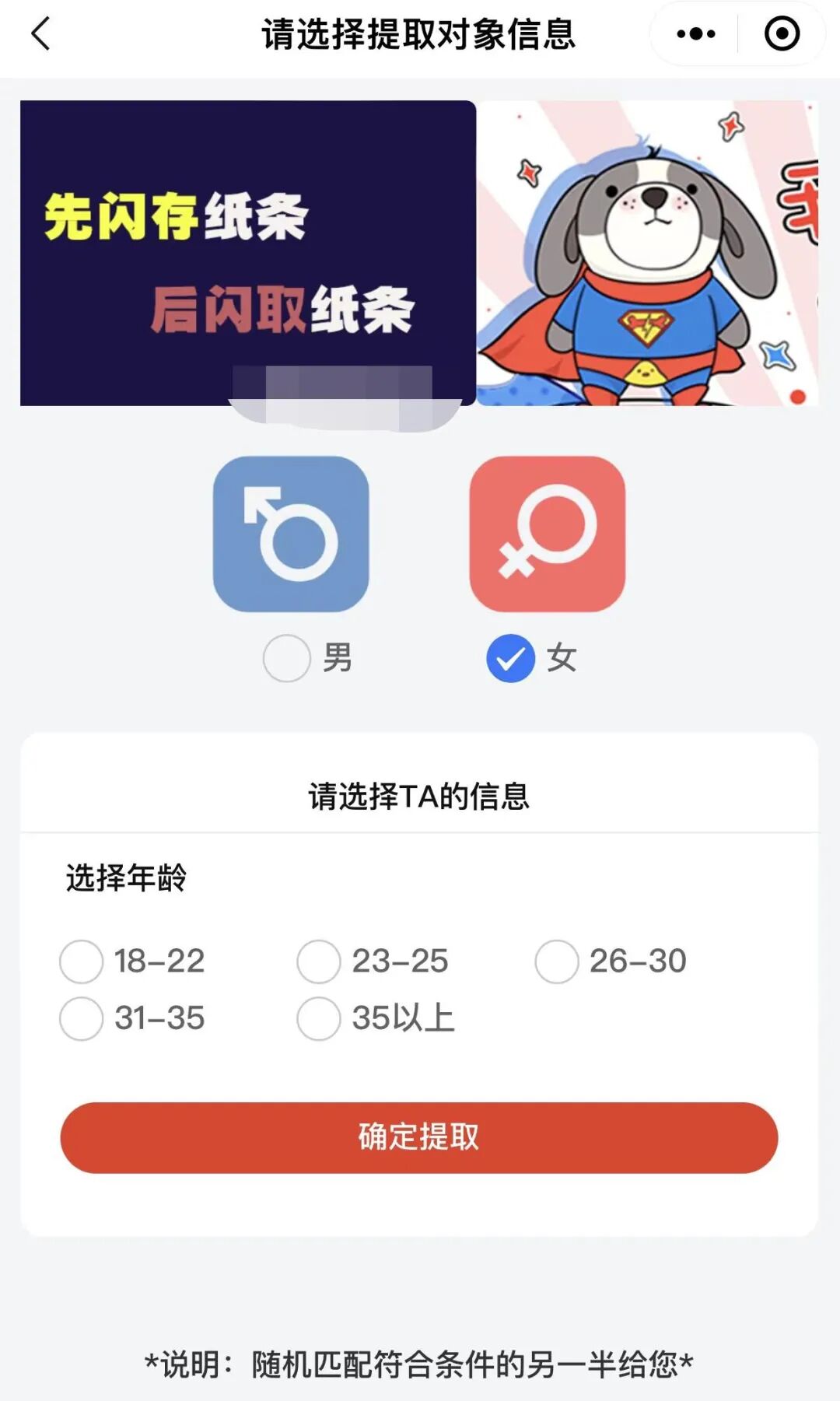 而“闪取纸条”的操作也差不多,顾名思义就是从盲盒里抽别人留下的联系方式,只不过选项多了很多,可以根据年龄段进行选择。