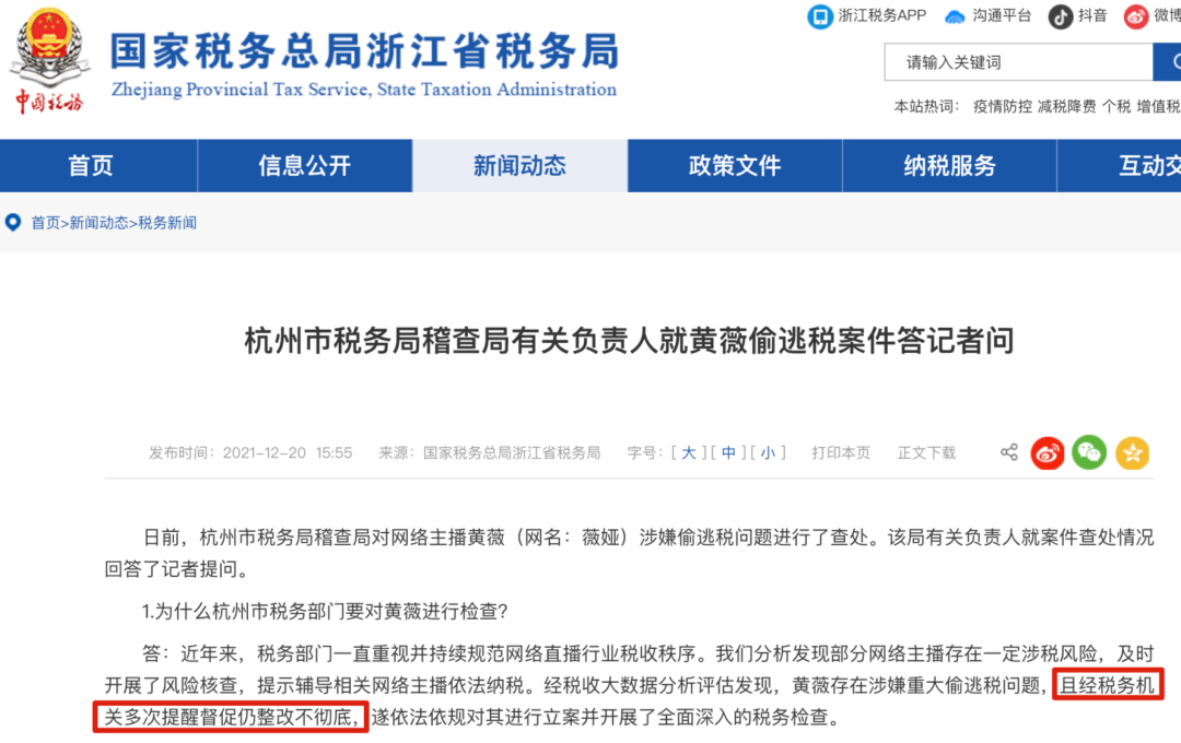 鸭鸭也从《杭州市税务局稽查局有关负责人就黄薇偷逃税案件答记者问》中发现:黄薇(薇娅真名)并非事先不知情,而是早就被“税务机关多次提醒督促”。