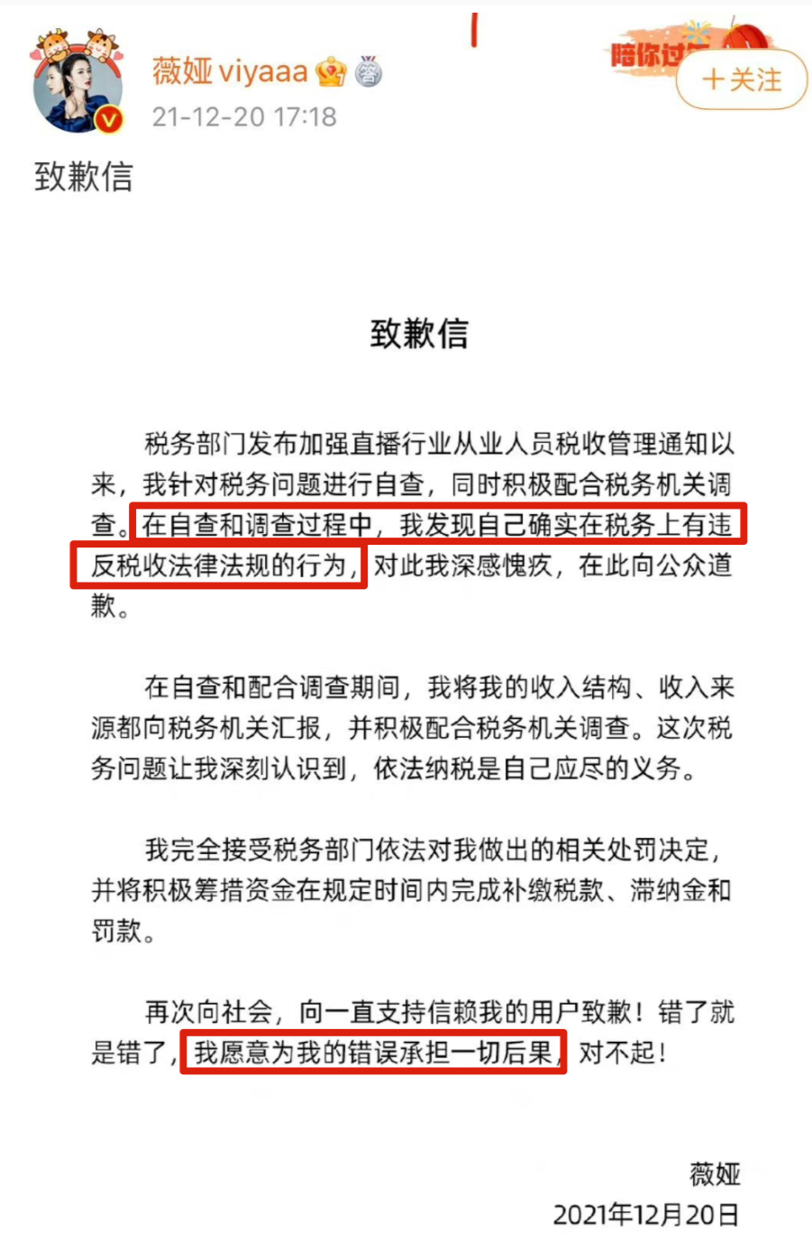 就在全网封杀的前夕,薇娅在微博发布道歉信,称:“我发现自己确实在税务上有违反税收法律法规的行为”。