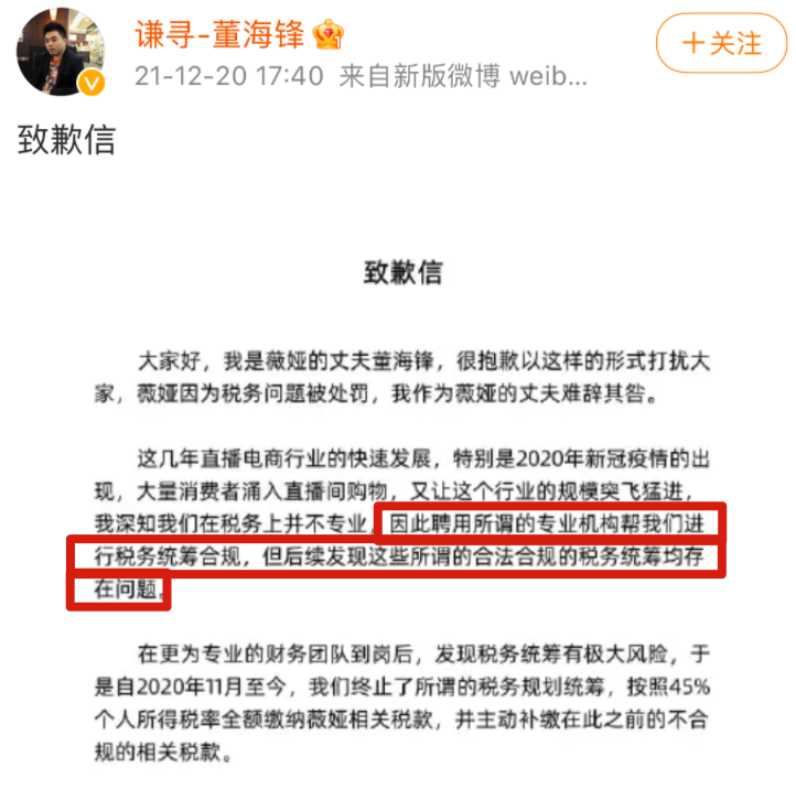 而这头“管钱的老公”也发文称,问题出在自己聘用的“所谓专业机构”上,是自己聘用的机构在进行税务统筹合规,但没成想都存在问题。