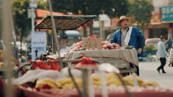 视频继续,视频开头出现的卖苹果的大哥一脸愁容。