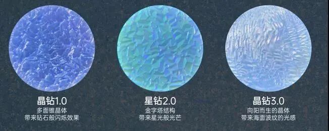 用更细小的晶体和更紧致规整的排列,降低了表面闪亮度,同时带来丝绒般细腻柔和的触感,下面是对比图片,细节更好理解。