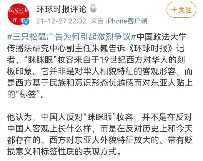 正如@环球时报评论 所说,我们反对“眯眯眼”妆容,并不是在反对中国人客观上长什么样,而是在反对历史上和今天都存在的、西方对东亚人外貌特征放大的、带有贬损意义和标签性质的表现方式。