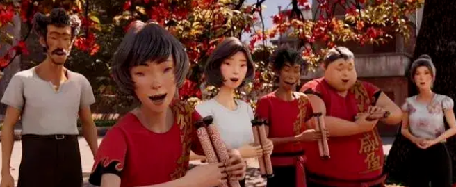 还有最近,上映的国产动漫电影《雄狮少年》,剧中的人物长相都为下图那样: