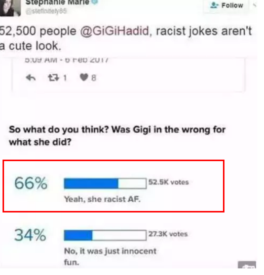 结果,有66%的网友投票:这是一个带有种族歧视的玩笑。