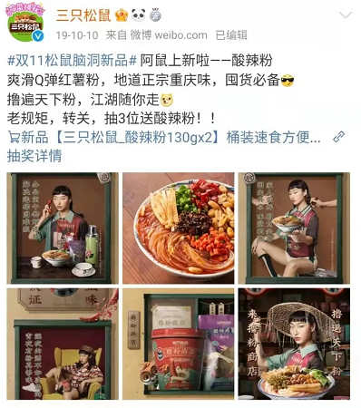 原来是有网友在社交媒体上爆料:三只松鼠之前有一系列酸辣粉、螺蛳粉的宣传海报,疑似存在丑化中国人的问题......