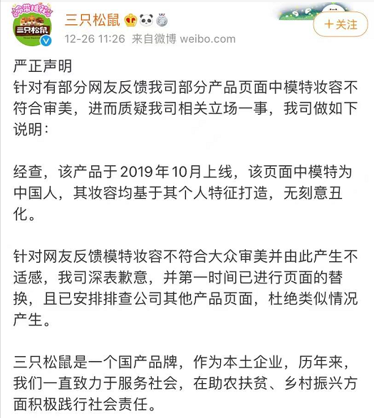 三只松鼠表示:自己的宣传海报是存在模特妆容可能不符合大众审美,该模特也是中国人,并无进行刻意丑化。