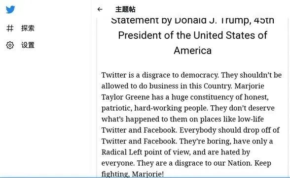 这是继特朗普卸任后因账号存在持续煽动暴力风险,被推特、脸书、Instagram和Snapchat等永久性禁言之后的第三次“废话攻击”。