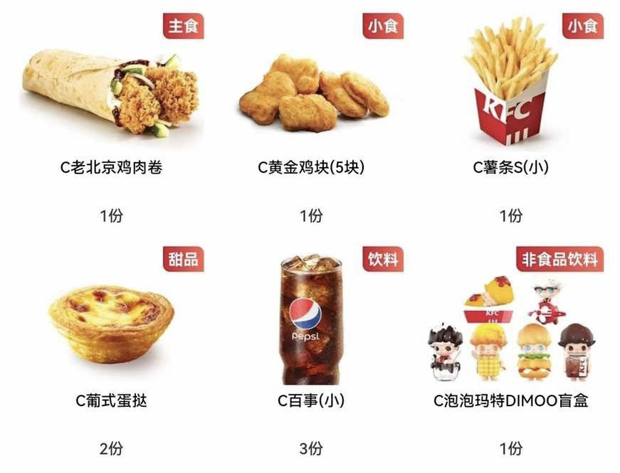 首先,全家桶大伙应该都吃过,KFC提供的是: