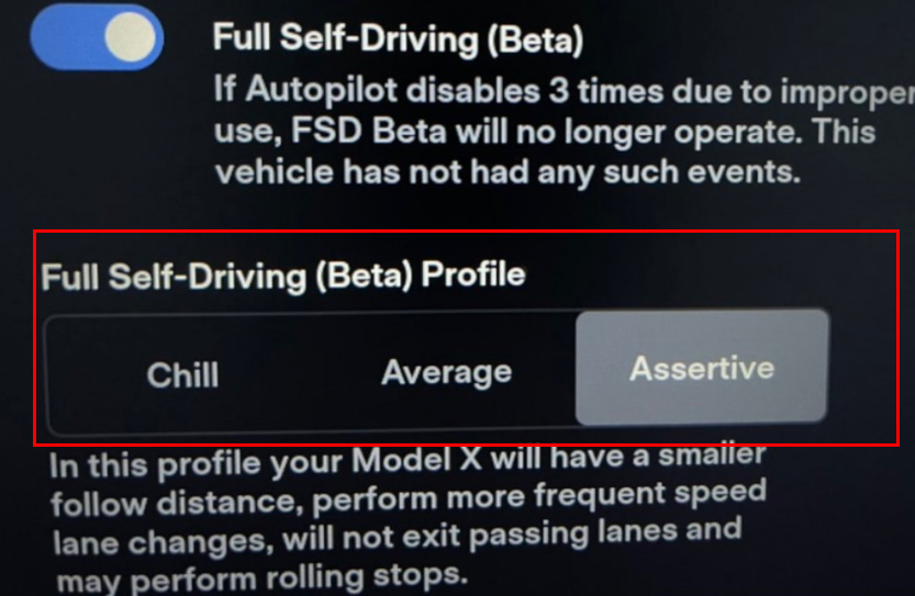 而这次最新的FSD(Beta)测试版中的三种配置包含:1.冷静(Chill)、2.均衡(Average)、3.自信(Assertive)
