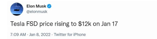 但更值得注意的是,随着特斯拉FSD大规模推送,其价格也水涨船高,马斯克最近也表示了:特斯拉FSD软件的价格将在1月17日调整至1.2万美元(约为7.65万元人民币)