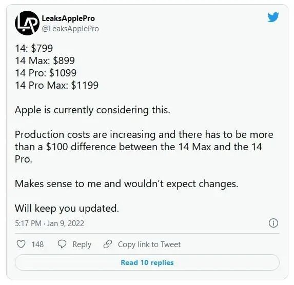 由于取消了“mini”版本,iPhone 14系列的起售价将直接为799美元,比iPhone 13系列的699美元起售价,增加了100美元。