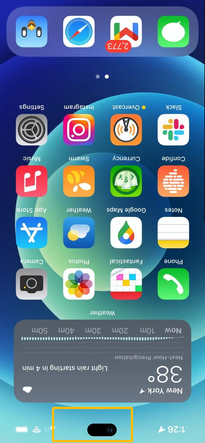 这张所谓的“药丸屏”iPhone,实际上是Jeff Grossman用了一张下图这样的“药丸”壁纸,然后把手里的刘海屏iPhone倒过来拍的……