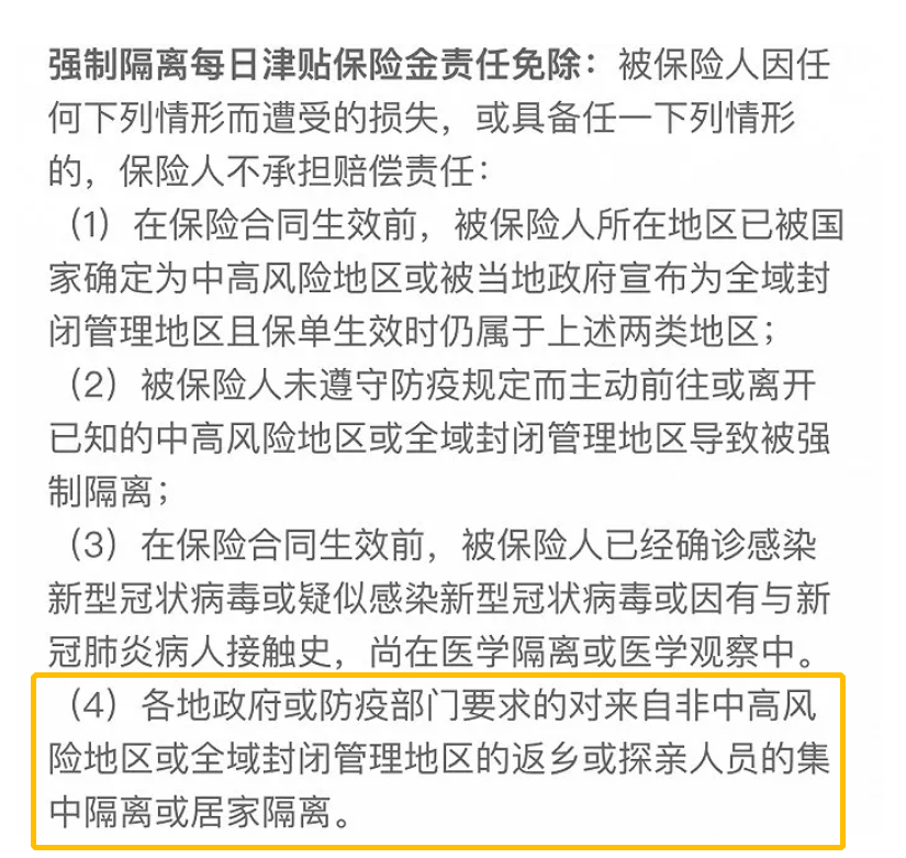 这等于居家隔离、免费集中隔离,还有从中高风险地区回家隔离等都不赔啊!