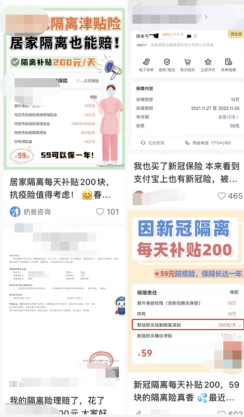 目前市面上有多款不同种类的隔离险,打的宣传标语基本是“新冠隔离一天发200元”、“投保仅需4元起”、“价格不到一杯奶茶钱”等。