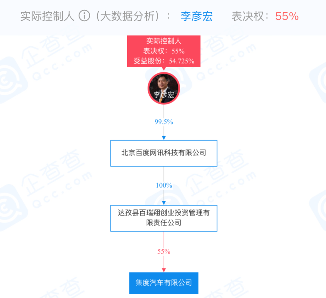 要知道,根据本鸭从企查查里获得的信息,这回百度掌门人李彦宏是“集度汽车有限公司”的实际控制人。