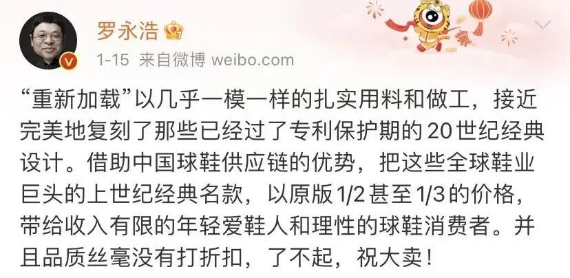 而老罗卖的这双鞋叫“重新加载”,是一款专门复刻经典鞋款的牌子。