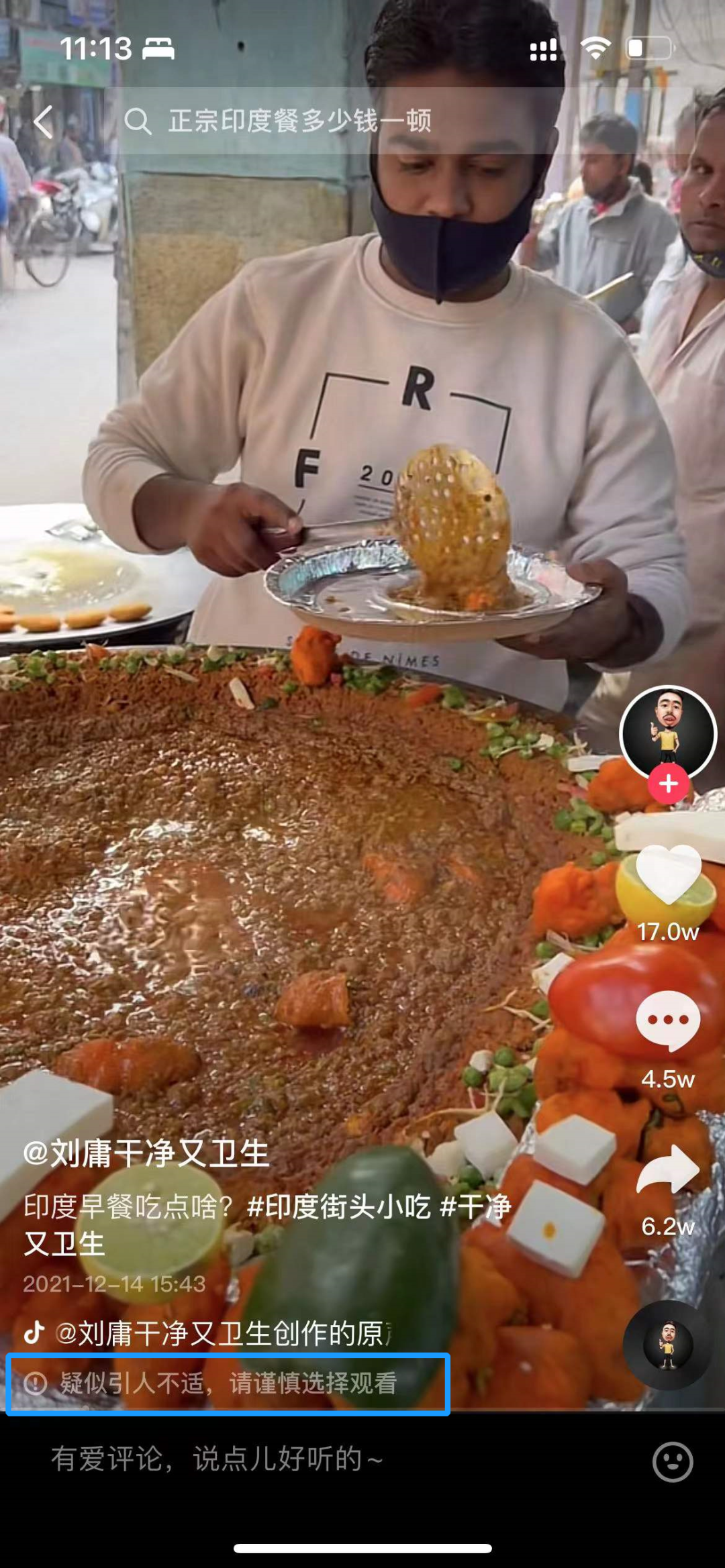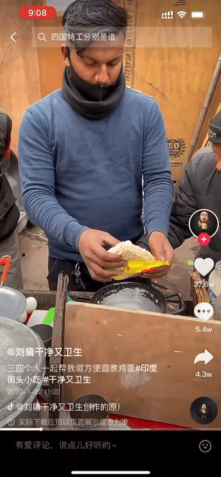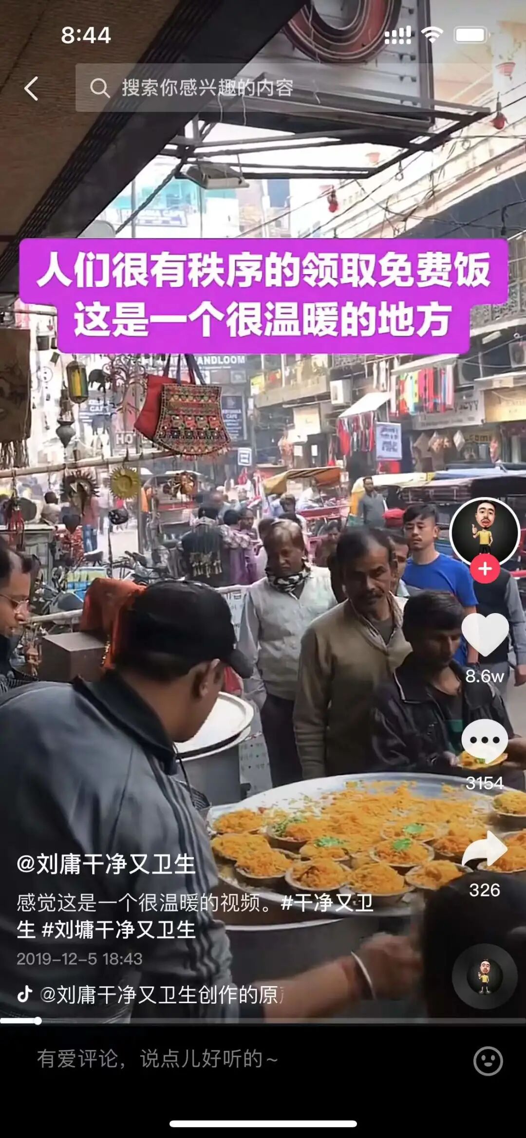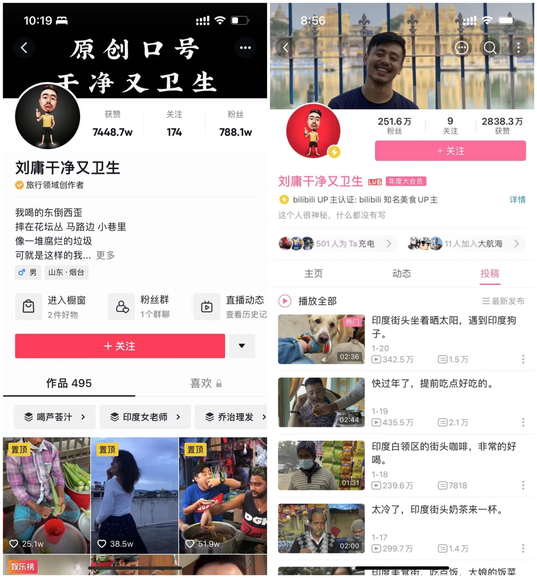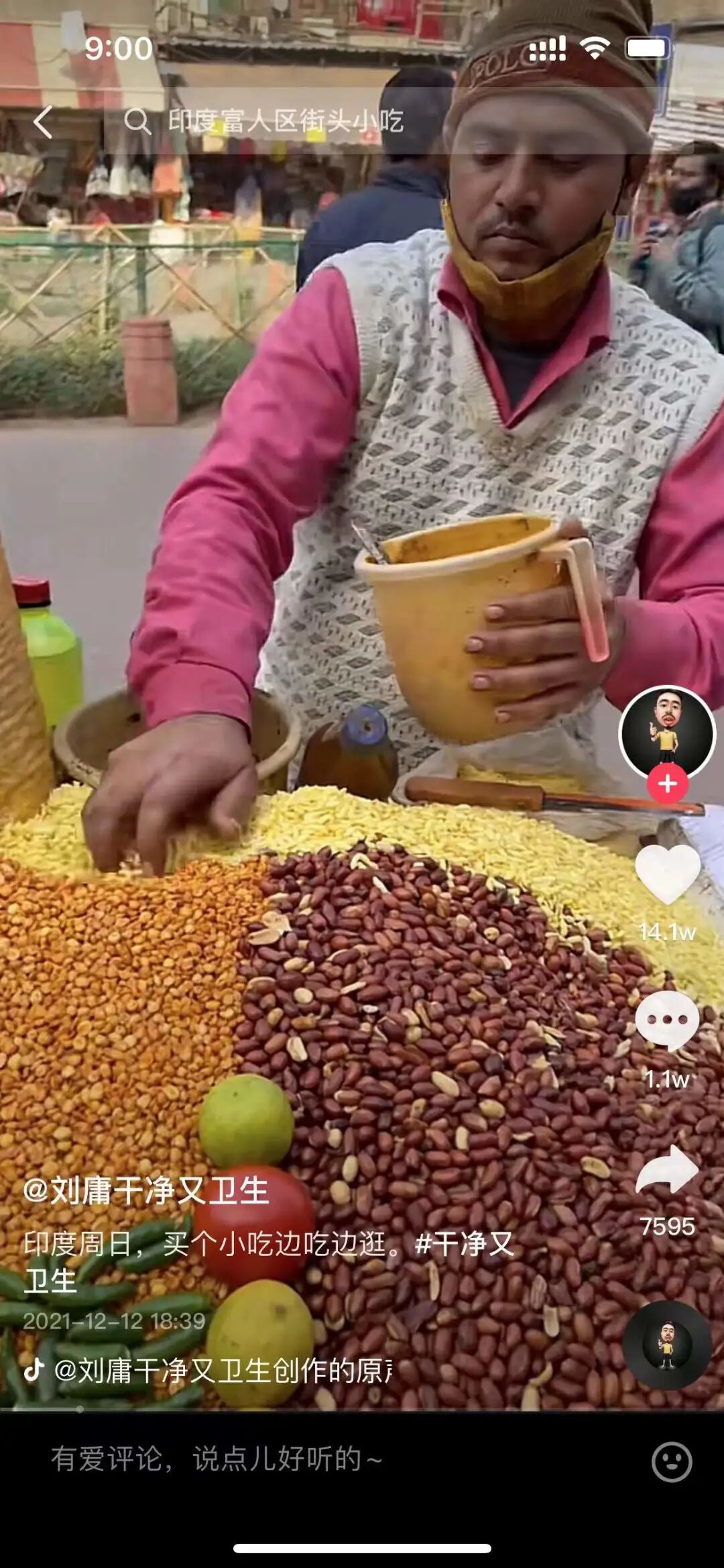 目前刘庸的账号暂时停更。在此之前,他每天都在印度街头寻找各种“干净又卫生”的印度特色小吃。