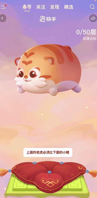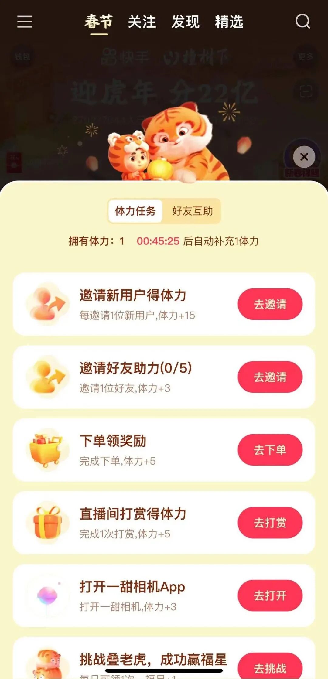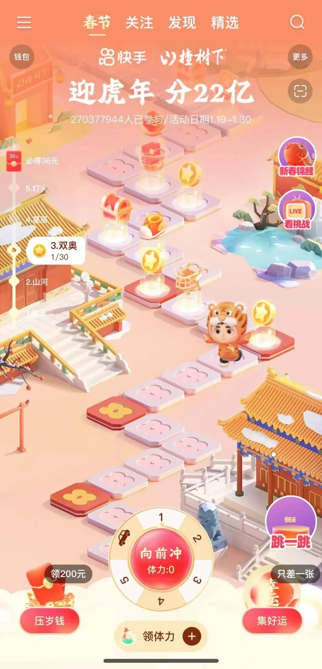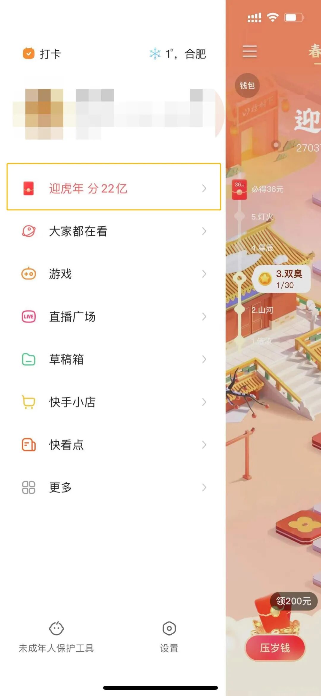 想要体验边玩边攒红包的朋友,只需把快手App更新至最新版本,点击左上角的“春节”标签,或是侧边栏选择“迎虎年,分22亿”即可参与活动。