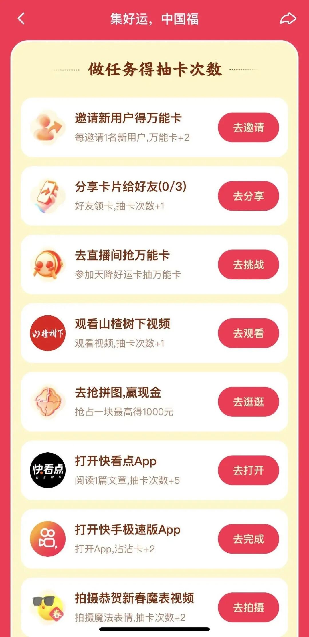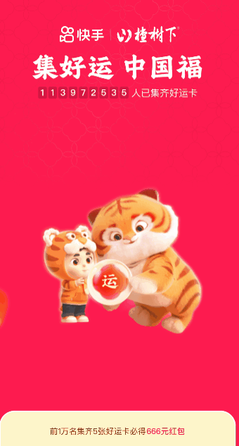 1月19日晚8点至1月31日晚6点期间,用户进入活动页面,即可获得抽卡机会,参与好运卡的抽取,每集齐5张好运卡即可合成1张虎福卡,并合成一个“好运红包”,参与除夕夜瓜分1亿现金红包。