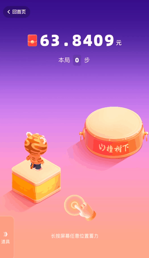 玩法就是用户长按屏幕蓄力松开后跳跃,成功落地可得红包,遇到特殊底座奖励翻倍,累计66元即可提现。