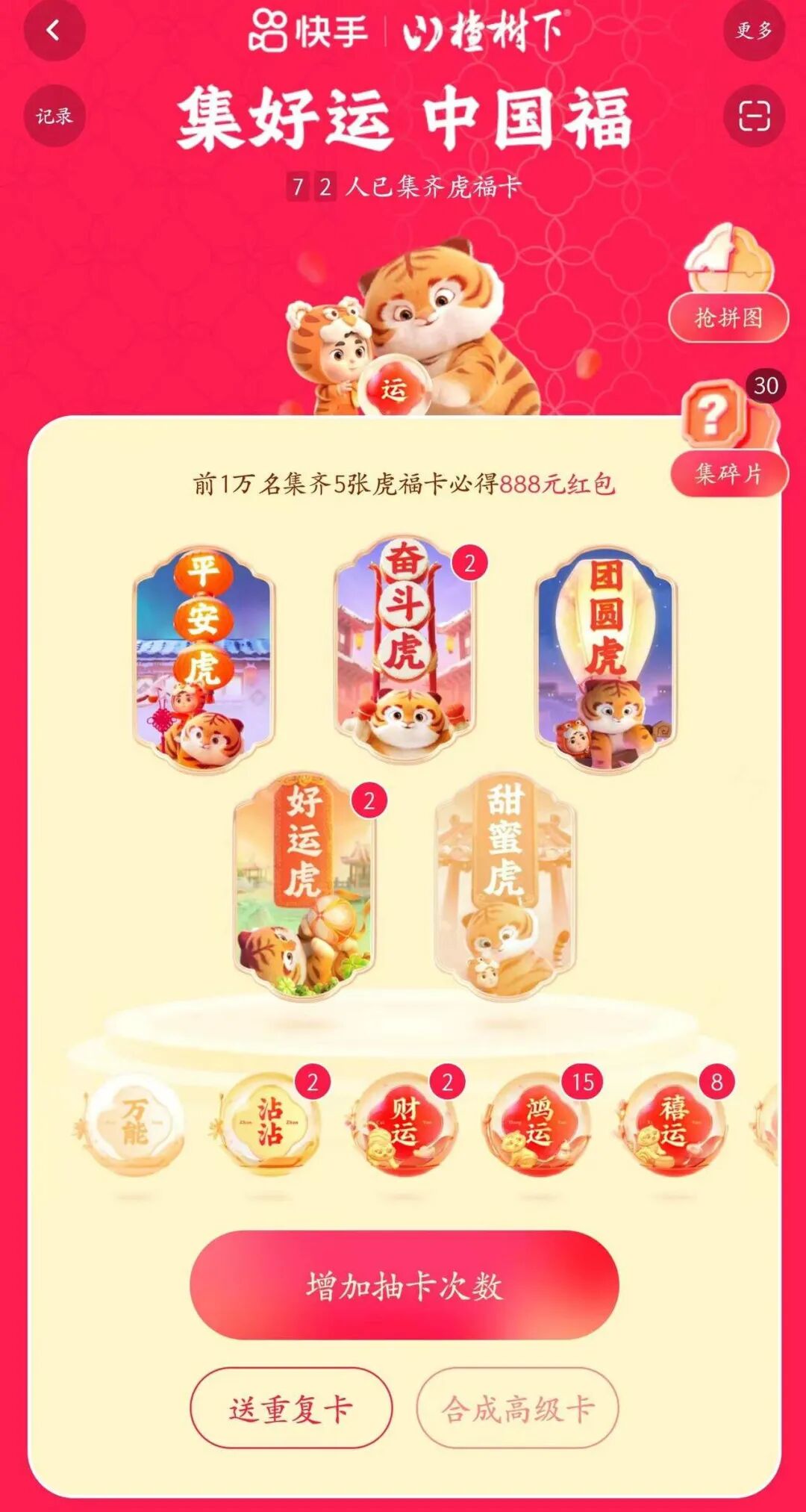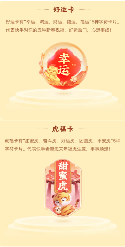 本次快手集卡活动分为两轮,分别推出好运卡、虎福卡两种福卡。