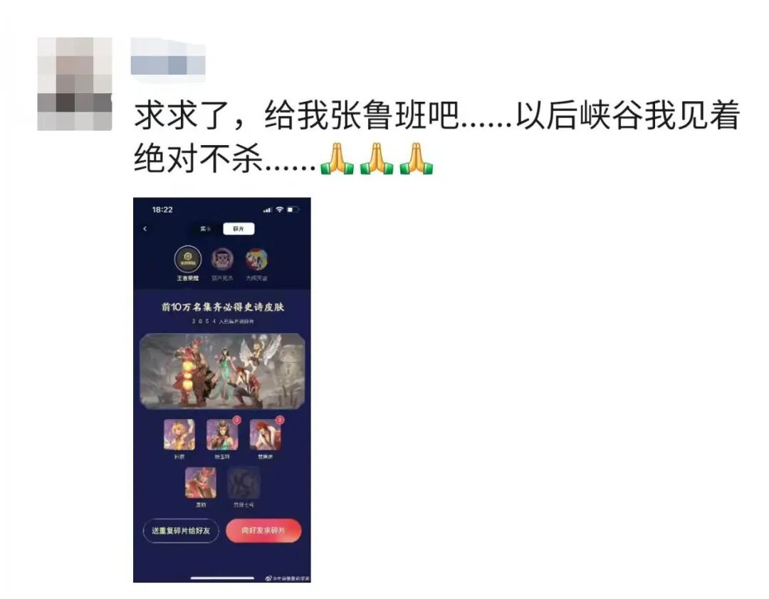 还有人为了换到一张《王者荣耀》系列集卡活动中,概率最小的鲁班七号碎片,朋友圈疯狂求卡……