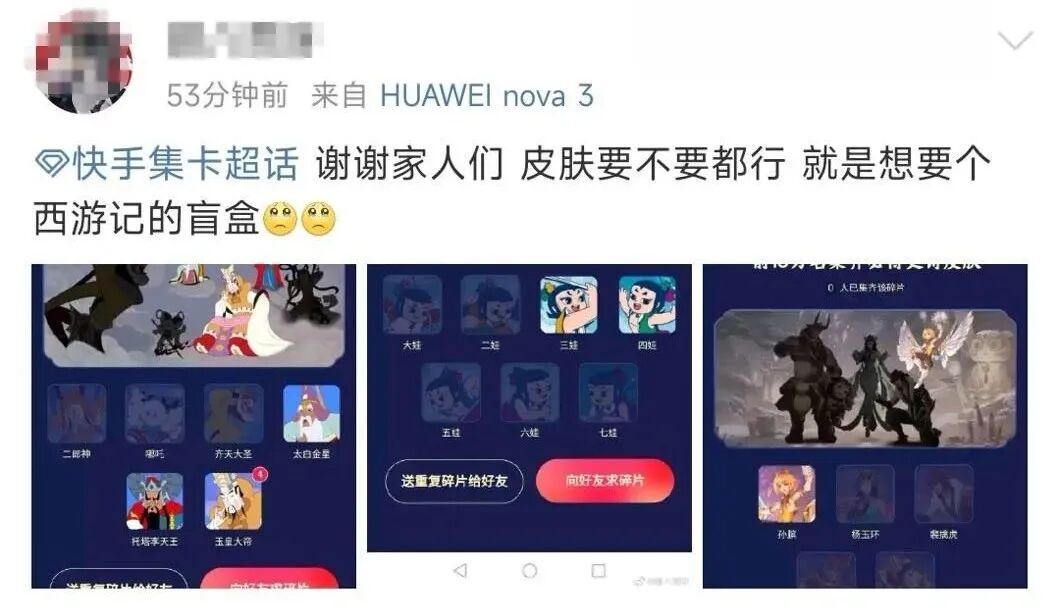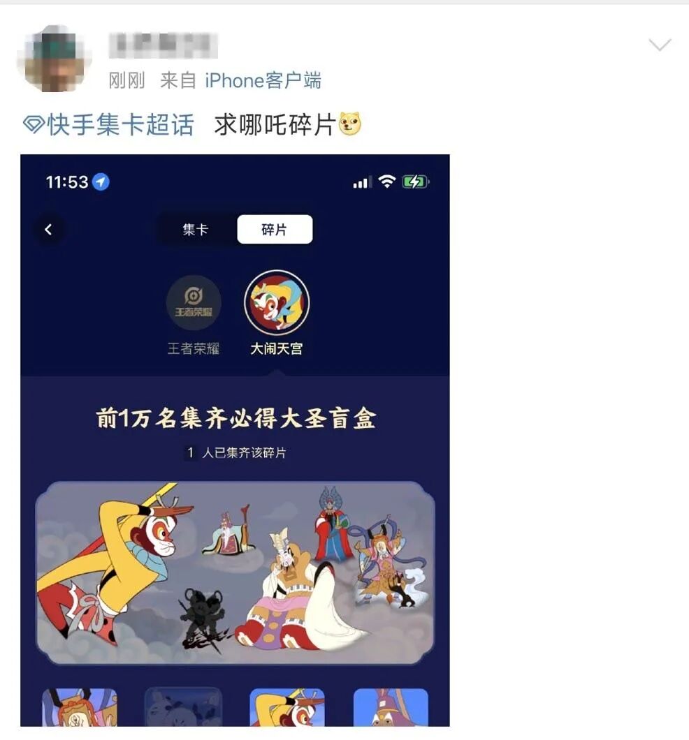 另外,攒福卡的时候还有几率额外爆出快手与《王者荣耀》、上海美术电影制片厂合作的主题碎片,筹齐就能兑换盲盒和稀有皮肤,千万别忘咯。