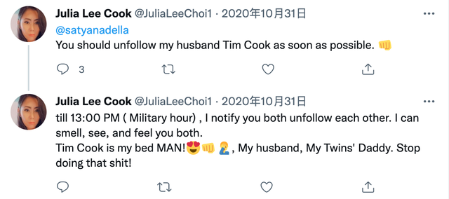 在2020年10月至11月中旬期间,她给库克发了近200封骚扰邮件,还注册了推特新账号,封面是库克照片。
