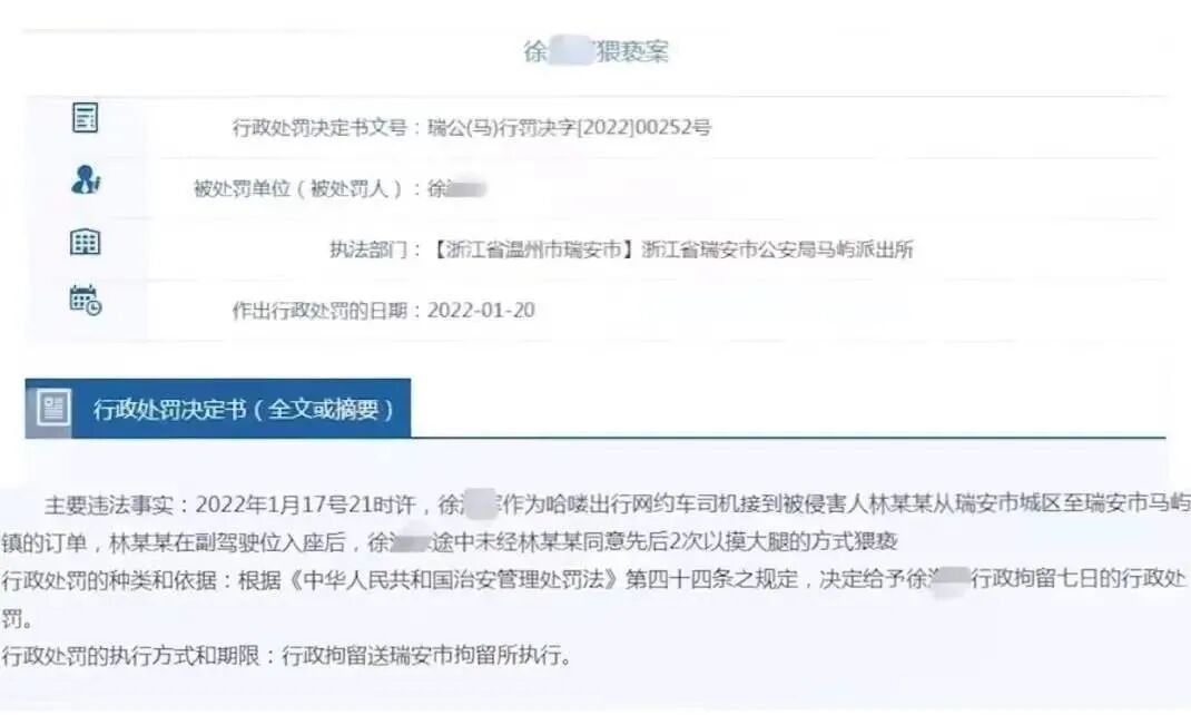 据浙江政务公开网,一名林姓女子投诉自己在乘坐网约车途中,在副驾驶座遭到网约车司机先后2次以摸大腿方式猥亵。