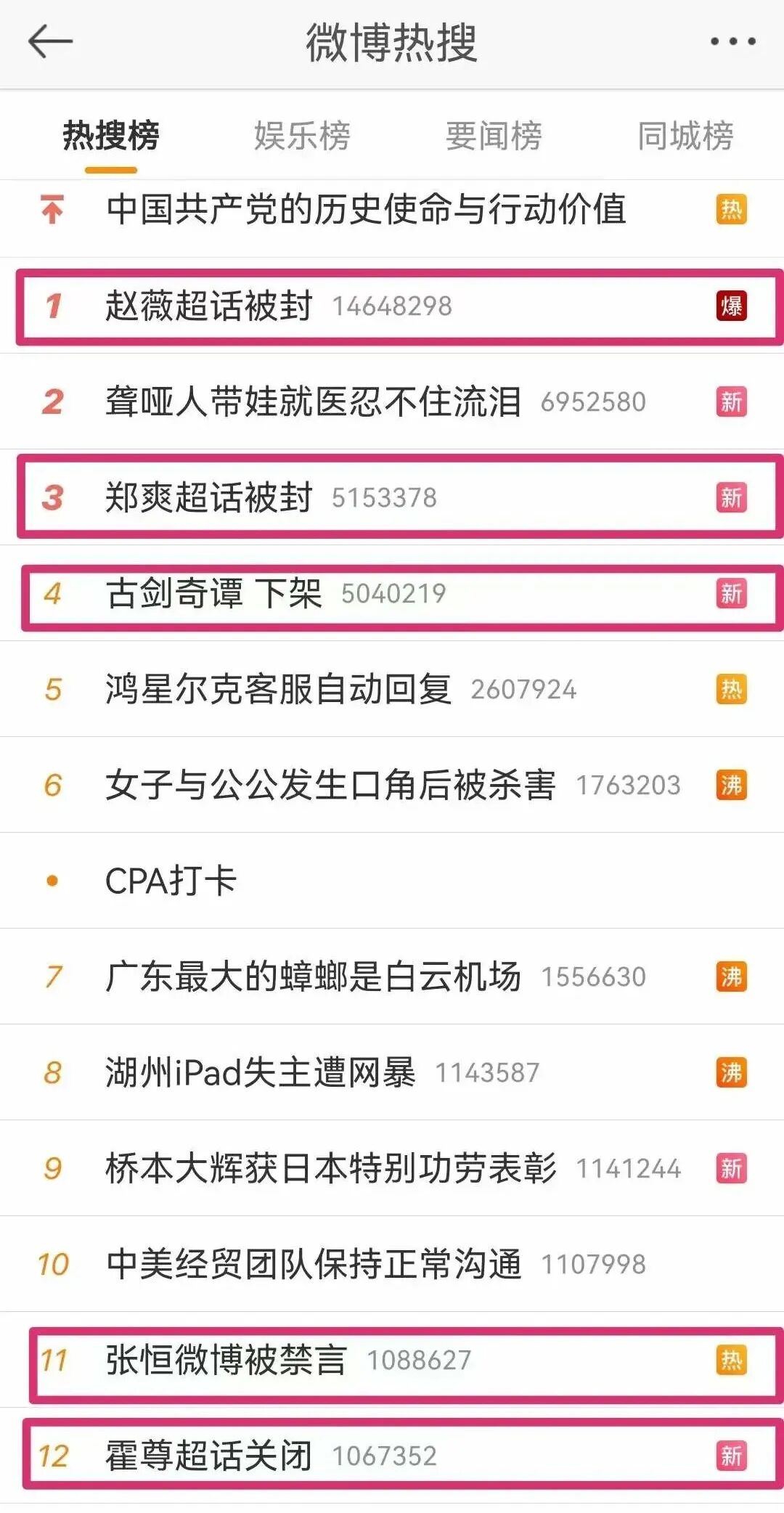 最近这几天,打开微博热搜,账号禁言、超话关闭、作品下线……满满的都是娱乐圈的瓜,或者换句话来说:娱乐圈“没了”……