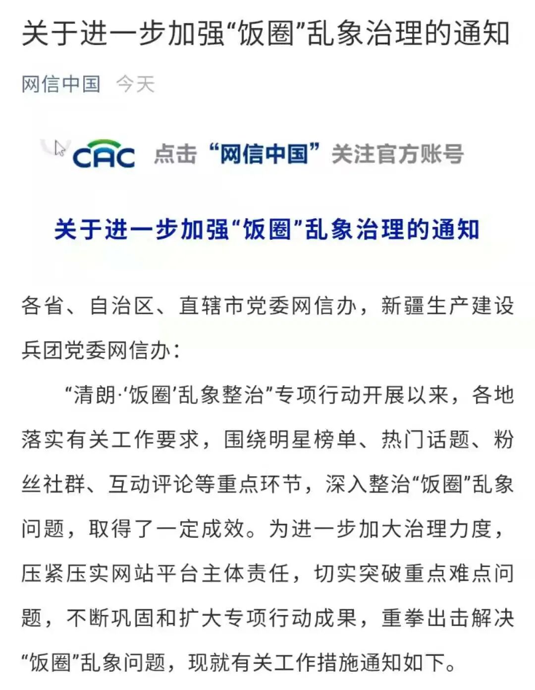 8月27日一大早,中央网信办重拳出击,发布关于进一步加强“饭圈”乱象治理的通知。