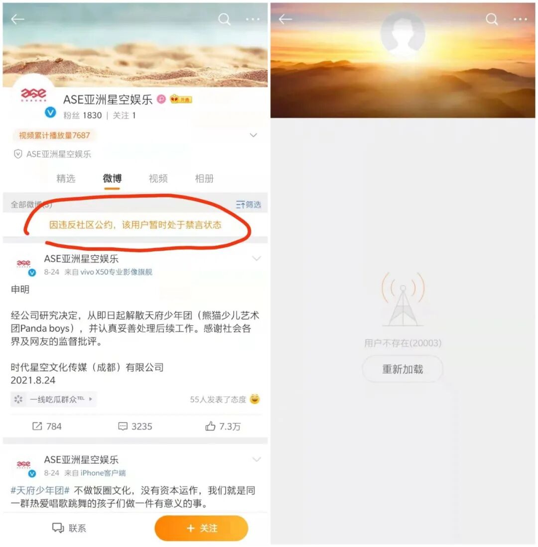 目前,该经济公司账号被禁言,熊猫少儿艺术团(天府少年团)账号则显示不存在。