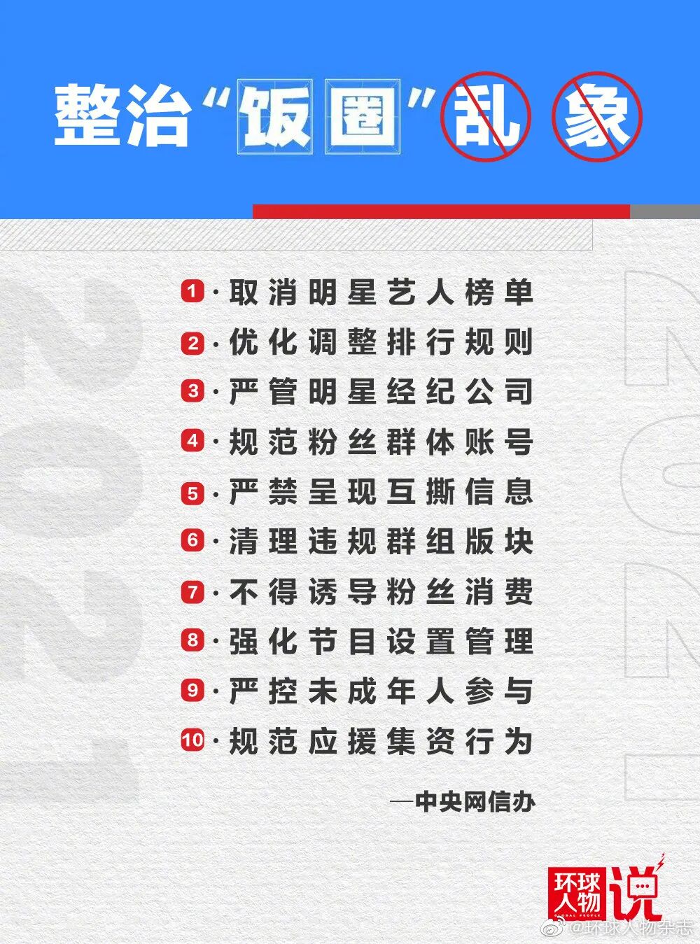 具体包括取消所有明星艺人的排行榜、严禁呈现饭圈粉丝互撕信息、严禁未成年人打赏应援消费等等十项措施。