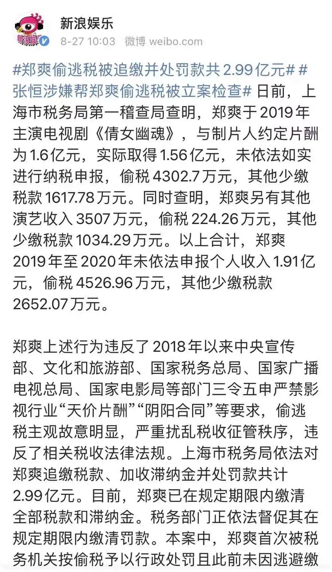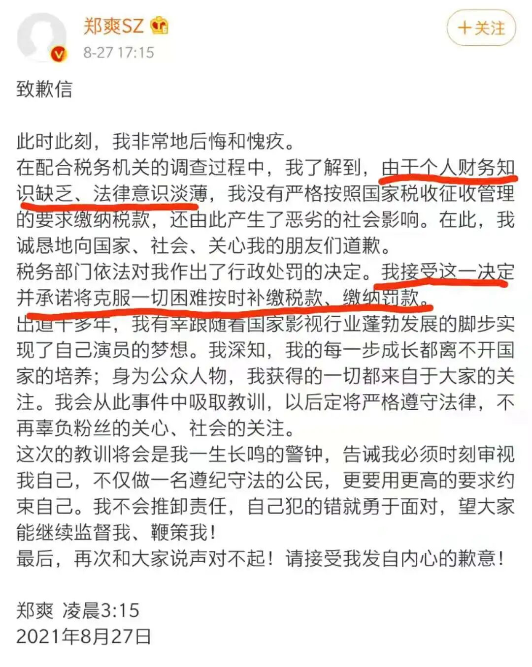 8月27日下午,@郑爽SZ 微博致歉,称“由于个人财务知识缺乏、法律意识淡薄,没有严格按照国家税收征收管理的要求缴纳税款”,自己将“克服一切困难按时补缴税款、缴纳罚款”。