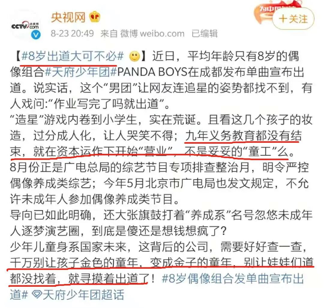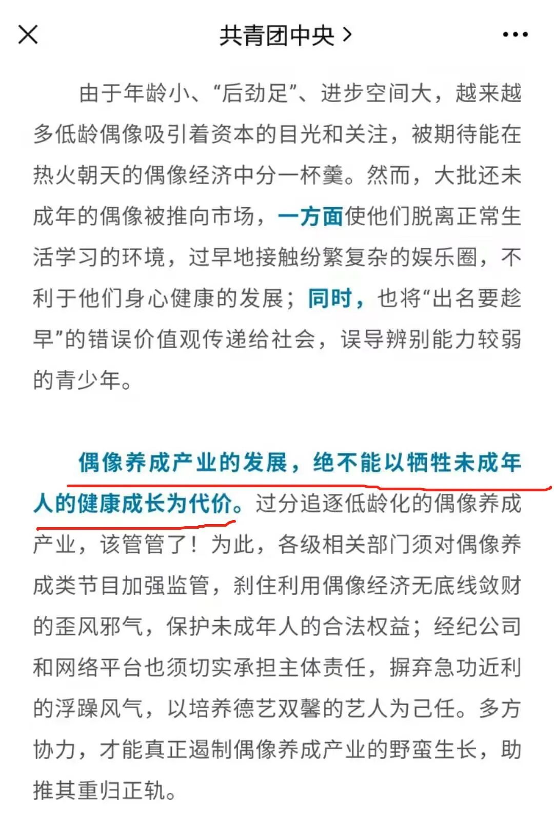 共青团中央也发文,偶像养成产业的发展,绝不能以牺牲未成年人的健康成长为代价。