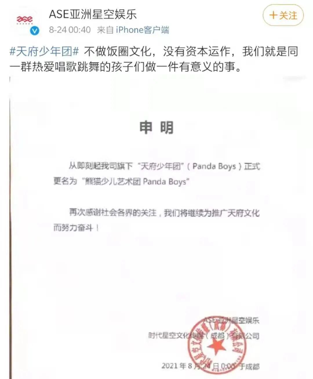 24日凌晨,该公司宣布“天府少年团”改名为“熊猫少儿艺术团”,并表示“不做饭圈文化,没有资本运作”。