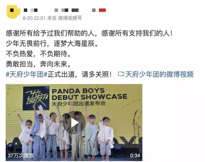 8月20日晚上,“天府少年团”宣布正式出道并发布组合单曲。这个团由7个小男孩组成,其中最小的团员7岁,最大的也只有11岁。