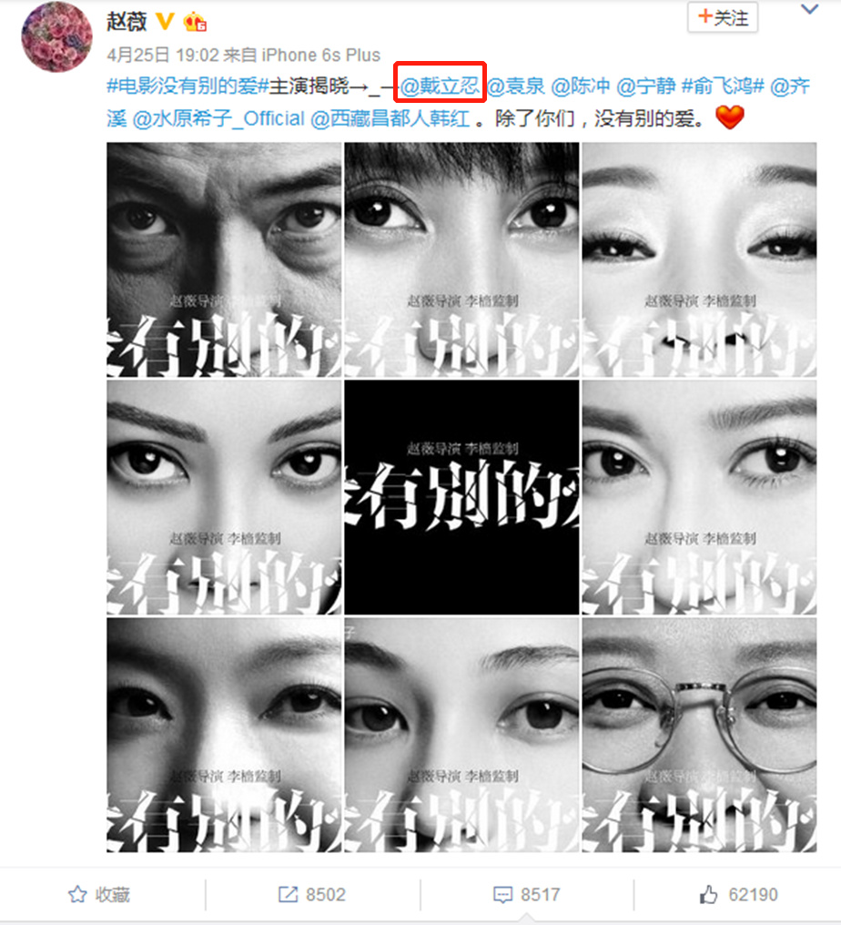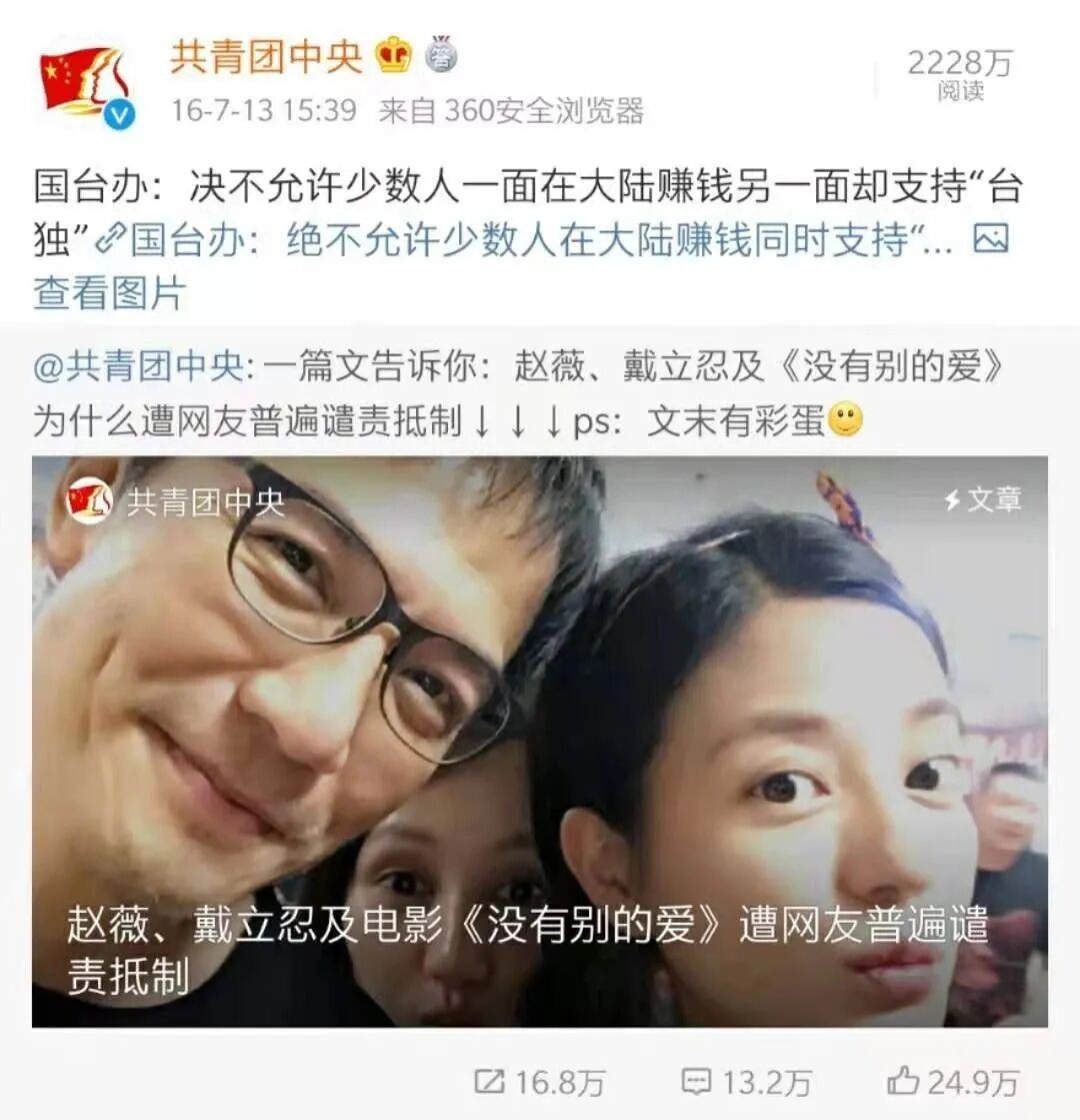 2016年,赵薇导演的《没有别的爱》男主角戴立忍被指曾参与台独相关活动。