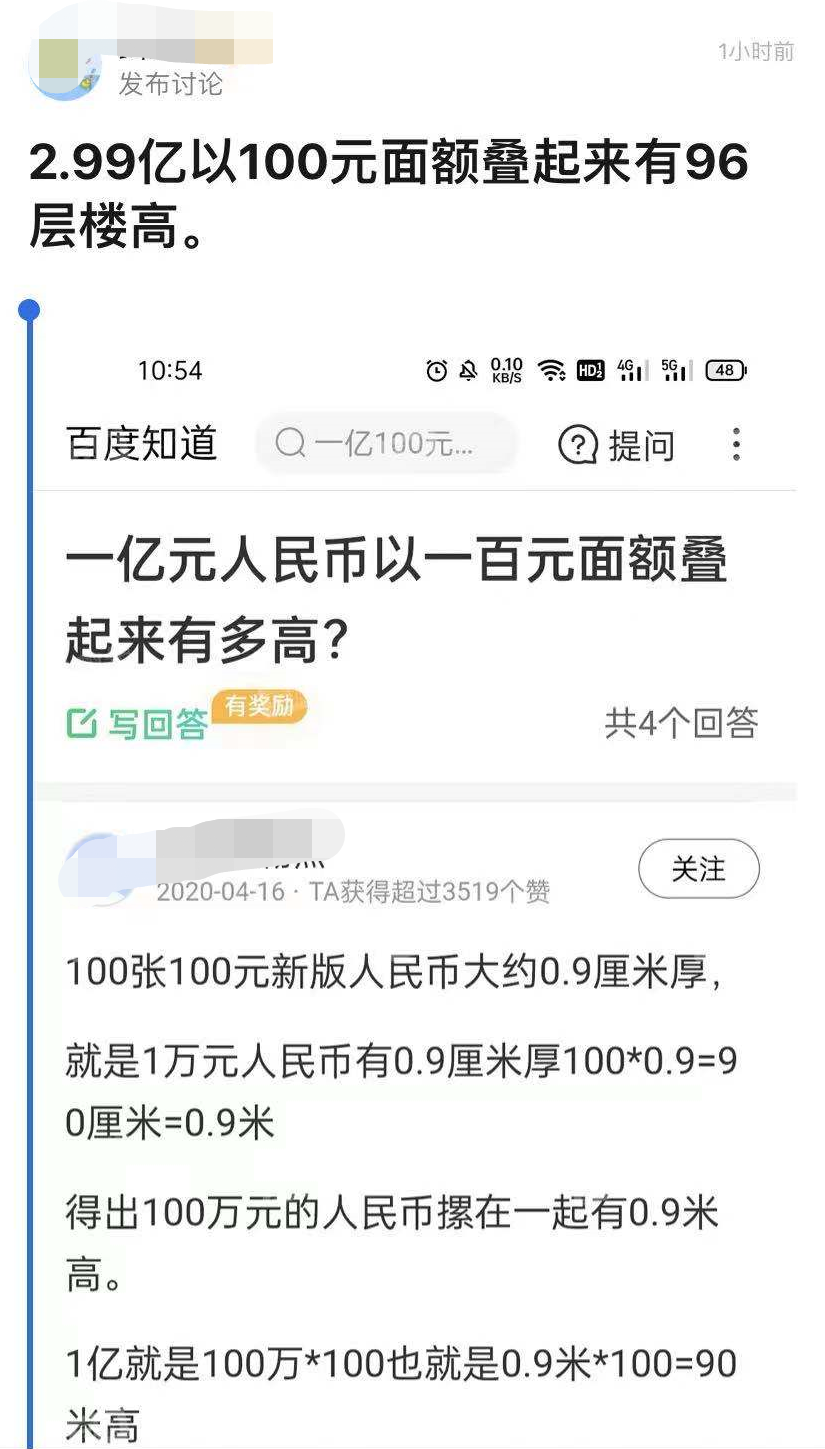 有网友算了一下,以100元面额叠起来,2.99亿有96层楼那么高。