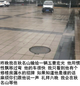 昨晚我在秋名山输给一辆五菱宏光,他用惯性飘移过弯,他的车很快,我只看到他有个修楼房漏水的招牌,如果知道他是谁的话,麻烦你们跟他说一声:礼拜六晚,我会在秋名山等他!