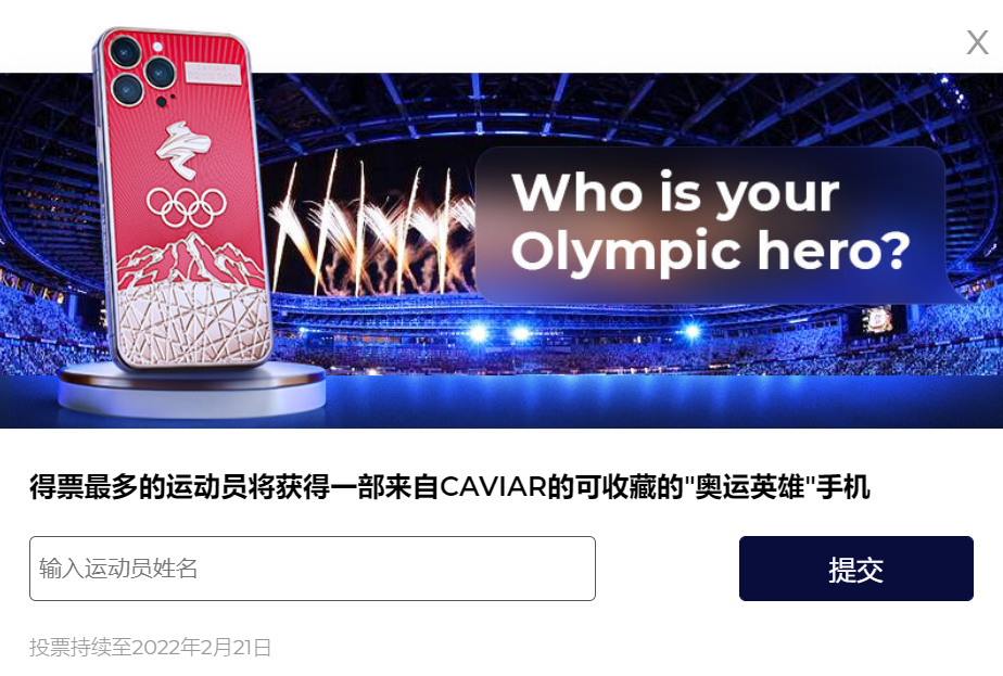 而这位最终获得【奥运英雄】手机的运动员,将由冬奥会期间所有访问Caviar官网的网友投票选出。