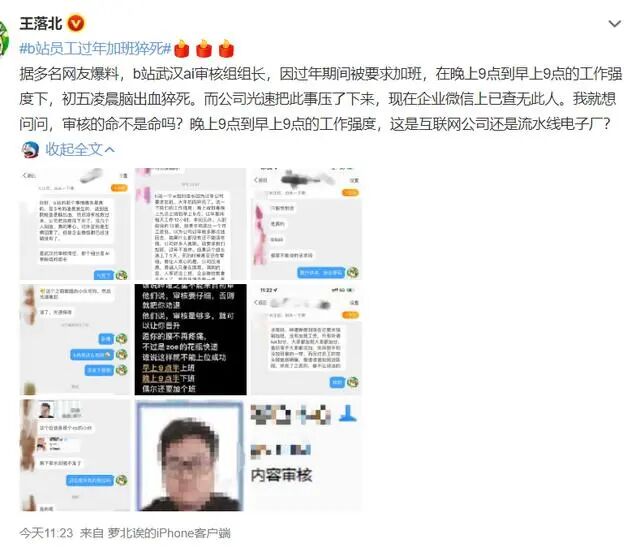 2月7日,有微博名为“王落北”用户称:“据多名网友爆料,b站武汉ai审核组组长,因过年期间被要求加班,在晚上9点到早上9点的工作强度下,初五凌晨脑出血猝死”。
