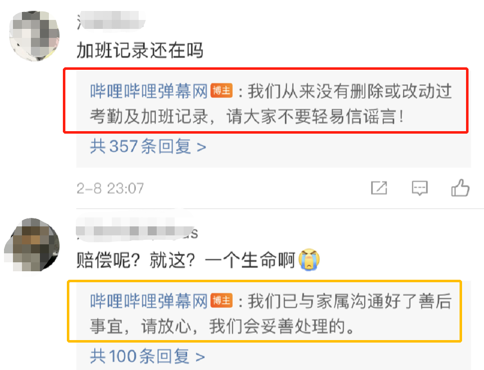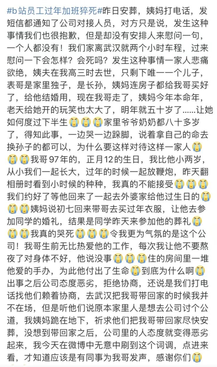 随后,2月8日晚23时许,B站通过官方微博就此前员工猝死一事发表长文。