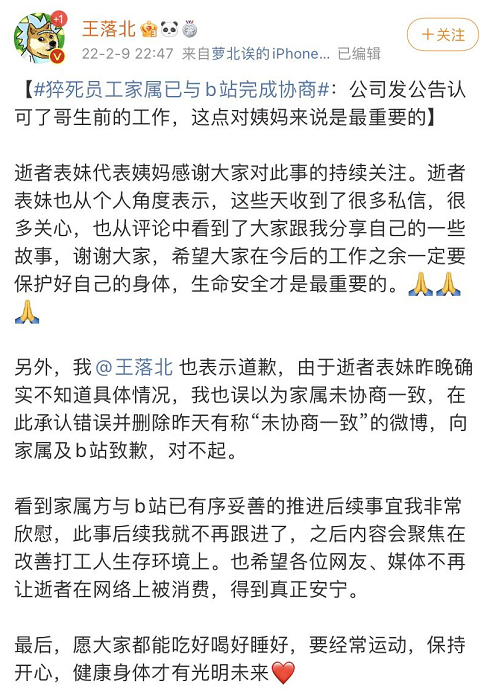@王落北 称,看到家属方与B站已有序妥善的推进后续事宜非常欣慰,此事后续就不再跟进了,之后内容会聚焦在改善打工人生存环境上。