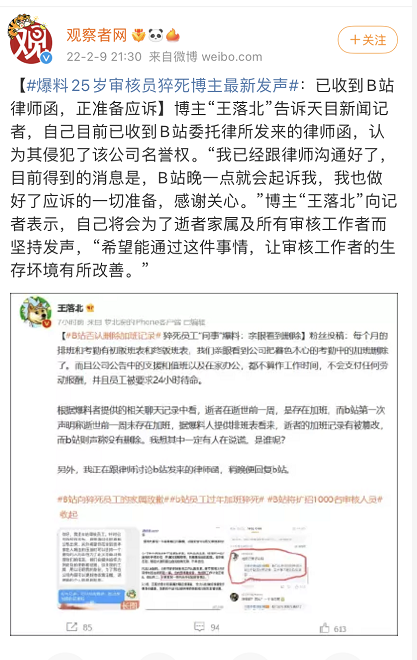 2月9日,曾曝光审核员过年期间猝死的博主@王落北 表示,已经收到B站委托律所发来的律师函。