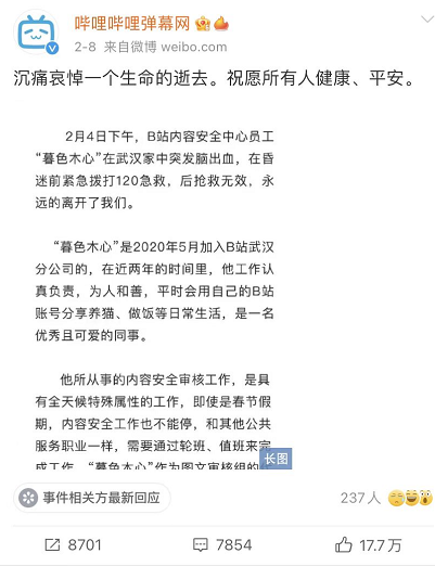 2月7日,B站发通告回应:“春节后第一个工作日,要和大家说一件非常难过的事情,内容安全中心图文审核部的伙伴“暮色木心”永远离开了我们。”